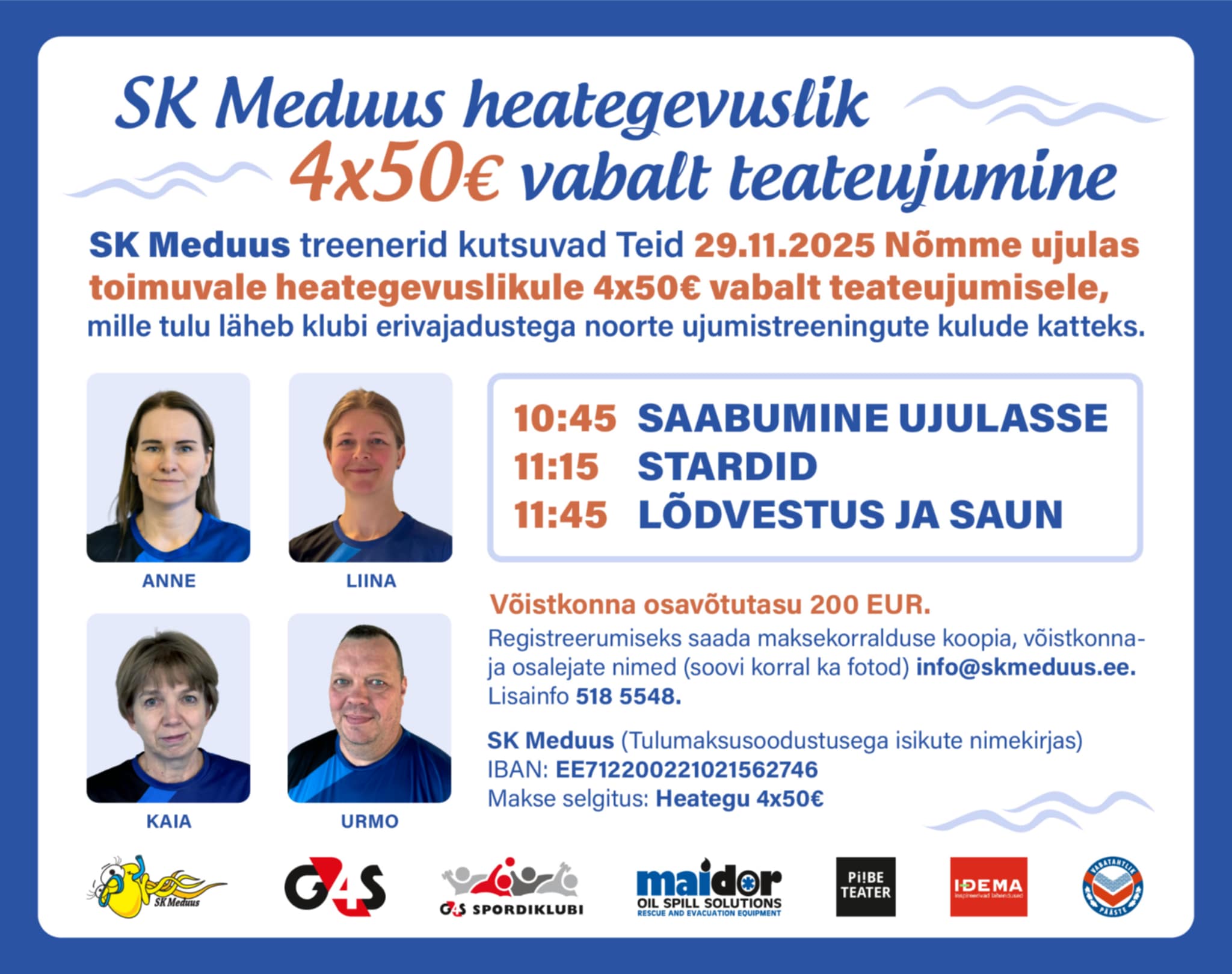 SK Meduus treenerid kutsuvad teid 29.11.2025 taaskord Nõmme ujulasse heategevuslikule 4x50€ vabalt teateujumisele, mille tulu suunatakse SK Meduus erivajadustega noorte ujumistreeningute kulude katteks. 2024.aastal kogusime 1170EUR, millega kaeti samuti klubi noorte treeningkulusid.